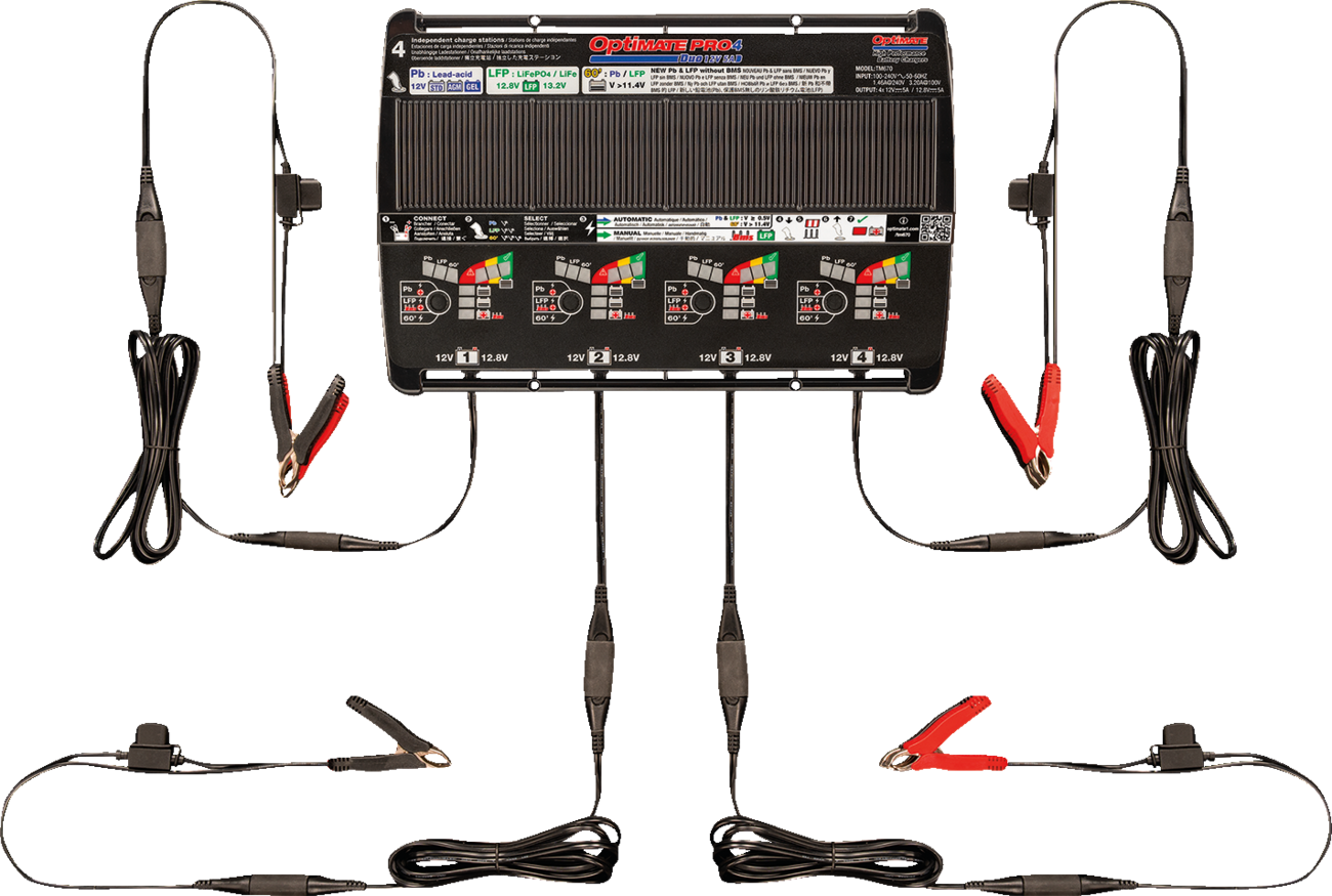 - 4 fully independent 5 Amp charging stations/banks, each with 3 Selectable modes to service NEW and USED powersport batteries